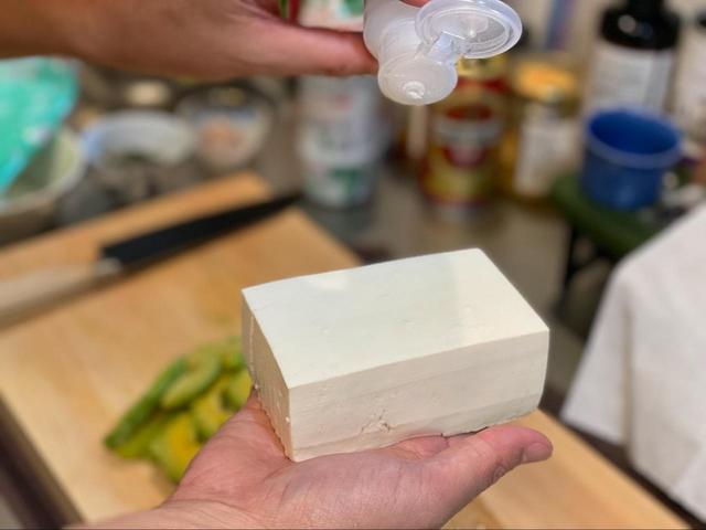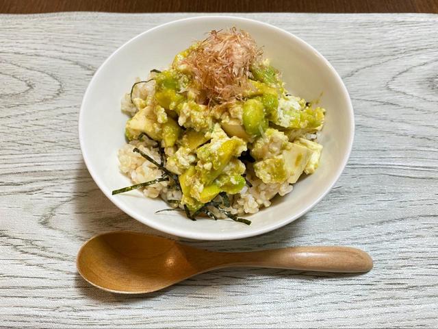 木綿豆腐を、電子レンジから取り出したら、サイコロ切りにして、ボウルの中でアボカドと混ぜ合わせます。
