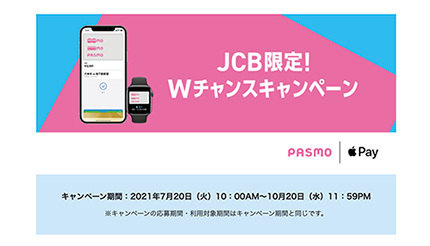 このキャンペーンにあわせてJCBは、エントリーの上、対象のJCBカードでApple PayのPASMOにチャージすると抽選で400人にPASMOチャージ1万円分をプレゼントする「Apple PayのPASMO×JCB限定!Wチャンスキャンペーン」を開始した。対象は「最大50%もどってくる!」キャンペーンにエントリーの上、キャッシュバックの条件を満たした人。