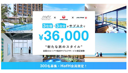 同実証実験では、新たな移動需要創出に向けた航空サブスクサービスに対するニーズなどを検証、把握するためのデータ収集を行い、KabuK Styleが運営する宿泊サブスクサービス「HafH」会員を対象に、JALの航空サブスクサービスを提供することで、これまでの出張や観光旅行だけでなく、「ワーケーション」や「多拠点居住」といった、密を避け好きな場所で働き、暮らすといったニューノーマルな体験価値の提案を行う。