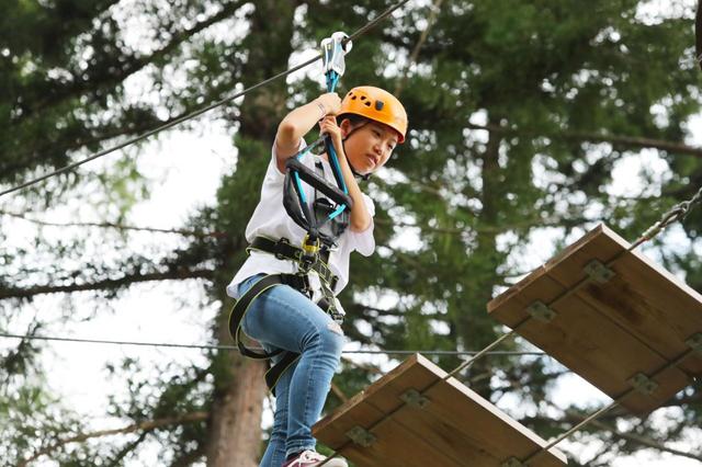 広大な森に設置されたエレメントをクリアしていく、国内最大規模の「ツリーアドベンチャー」。ヘルメットやハーネスなど、世界基準の安全装備を装着するので、なんと4歳から体験可能です。