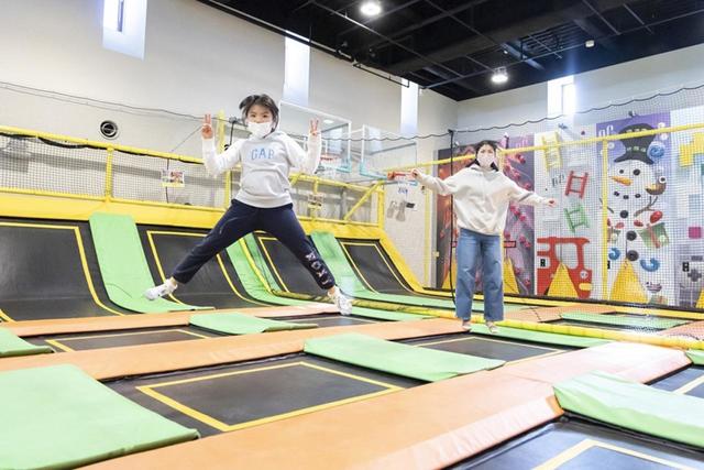バスケットゴールもあるスクウェアトランポリンは老若男女を問わず楽しめるアクティビティです。