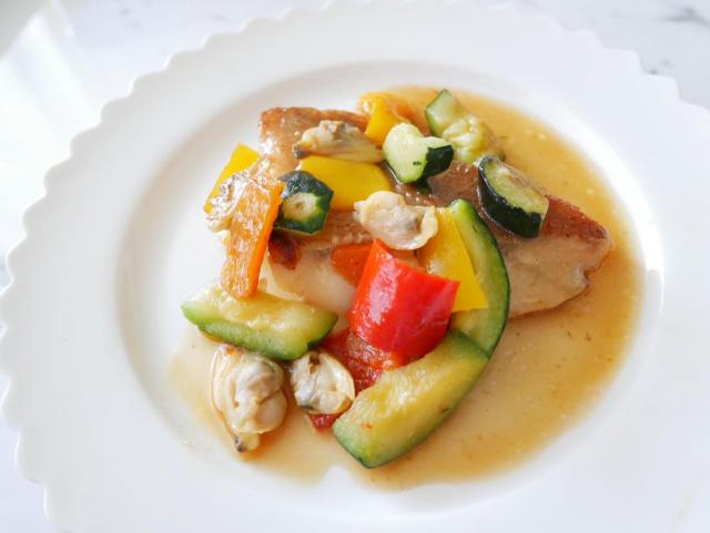 白身魚を両面焼いた後、グリル野菜のズッキーニや赤ピーマン、黄ピーマンなど他の具材を全部入れてさらに炒め、最後にソースを入れるだけ。