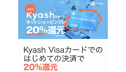Kyashは、デジタルウォレットアプリ「Kyash」ダウンロード後の初回利用時にオンライン加盟店で決済すると、Kyash Visaカードの決済額の20%・最大1000円相当をKyashポイントでキャッシュバックする「ネット決済限定!はじめての決済で20%還元キャンペーン」を実施している。終了時期は未定で、条件に達し次第終了。