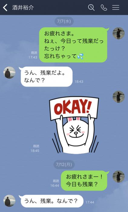 前まではそんなことなかった気がして、トークを遡って確認してみると、以前は質問返しをせずに『うん、残業』と簡潔に返事をしていて…些細なことですが、すごく気にかかりました(笑)
