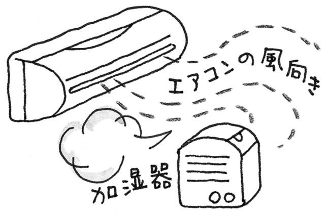 (2)目に風があたると乾きの原因になるので、エアコンの風向きに注意しよう。加湿器を置いて空気の乾燥を防ぐとよい。
