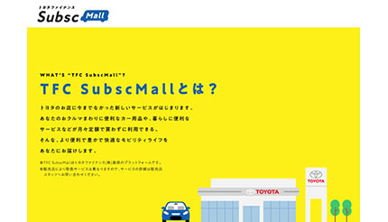サブスクリプションサービス(サブスク)の定義は定まっていないが、「月額制または年額制」「事前決済・未利用でも返金なし」「一定の条件で利用し放題」などが挙げられるだろう。メインのサービスにプラスアルファの複数のサービスと追加した総合サービスも多い。 トヨタファイナンスは、モビリティライフの充実を目指すサブスクリプションプラットフォーム「TFC SubscMall」をリリースした。先行導入販売店(徳島県、茨城県)で開始し、順次拡大していく。