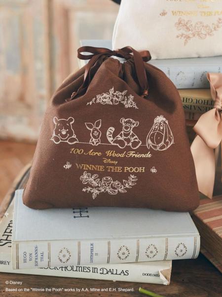 今年は、ナチュラルな雰囲気のデザインで、トートバッグ2種、ポーチ、巾着がラインアップ。今回新しく加わった巾着、そして定番のポーチは、プーさん、ピグレット、ティガー、イーヨーが愛らしく並ぶデザインになっています。