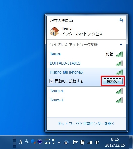 Windowsで接続する場合も同様にタスクトレイのWi-Fiマークをタップ。アクセスポイント一覧から自分のiPhone名を選択して「接続」をクリック。