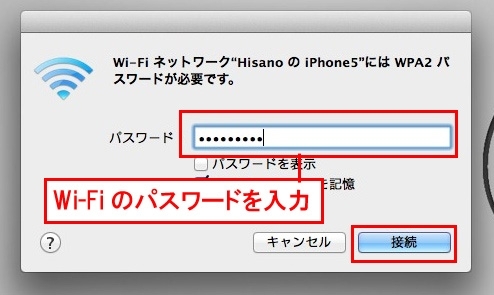 自分のiPhone名をクリックすると接続用パスワードを求められるので、iPhoneに表示されていた「Wi-Fiのパスワード」を入力。