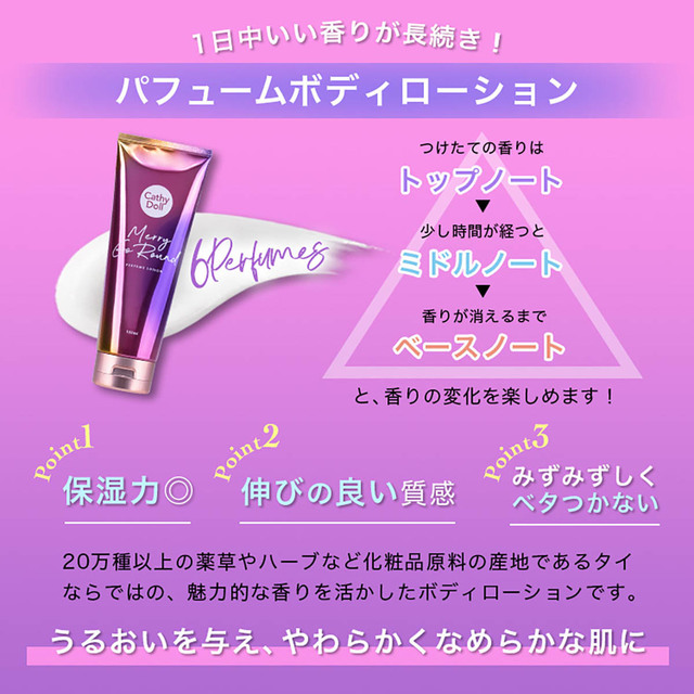 ほかにも、ユニセックスに使える「メリーゴーランド パフュームボディローション」、落ち着いた大人っぽい香りの「ワンスアポンアビーチ パフュームボディローション」など、6種類の中から好きな香りを選べます。
