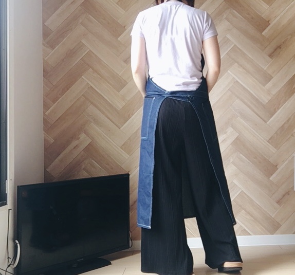 サイズはフリーサイズで、身長160cm程の筆者が着用するとひざ下までしっかり隠れ、ズボンが汚れたりケガしたりするのをを防いでくれます。