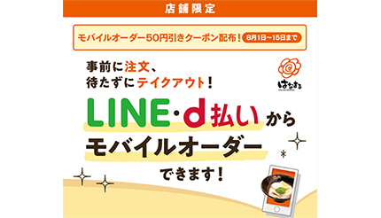「はなまるうどん」では8月15日まで、LINE Payやd払いアプリで「モバイルオーダー50円引きクーポン」を配布している。モバイルオーダー実施店舗が対象となる。