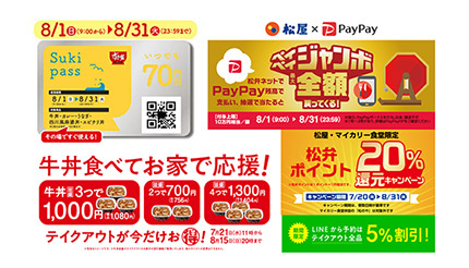 松屋は8月1日からスマートフォン決済サービス「PayPay」とコラボした「飲食ネット注文で当たる!ペイペイジャンボ」を開催中。対象になるのは、持ち帰り弁当サービスの「松弁ネット」。決済時にPayPayを利用すると、抽選で決済金額が戻ってくるくじを引ける。