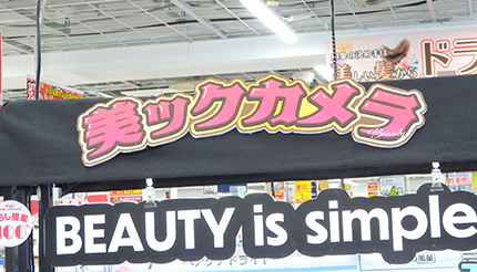 新しい店舗に足を運べば一目瞭然、売り場からワクワク感が伝わってくる。例えば、ビューティー家電コーナーのエンド展示では、「美ックカメラ」という手書きPOPが目に入る。肌の質感を測定できる最新美容家電の体験会も開催され、美顔器や洗顔ブラシと一緒に展示する。