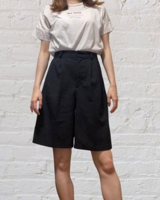 Lサイズを購入したところ、丈は膝上くらいでした。Aラインで裾広がりのデザインになっているので、ショートパンツですが大人っぽく着こなせます。