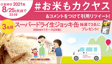 キャンペーンでは、同社のサービスをより多くの人に知ってもらうため、「#お米もカクヤス」のハッシュタグとコメントを付け「引用リツイート」をした人の中から抽選で「アサヒスーパードライ生ジョッキ缶 340ml 1ケース」を3人にプレゼントする。