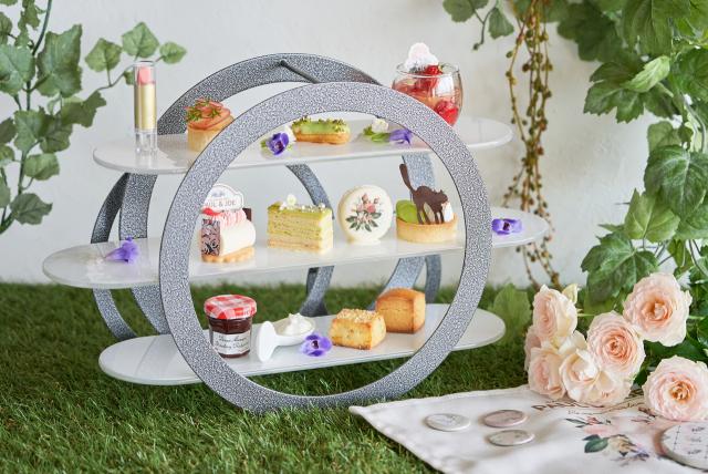 アフタヌーンティースタンドは、スコーン&ストロベリースコーン、バラのムース仕立て、ピスタチオのエクレア、リンゴのタルトレット、タルトシトロン シャインマスカットを添えて、オペラピスターシュ、マカロン、リップ型チョコ、ラズベリーヴェリーヌなど、可愛いサイズでさまざまな味を楽しむことができるメニューです。