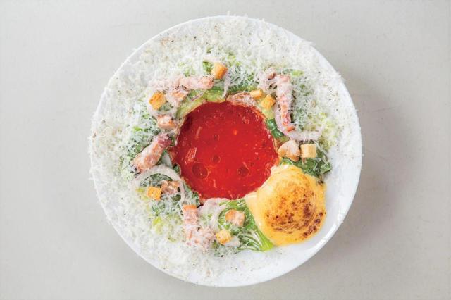 フレッシュ&しゃきしゃき食感の濃厚クリーミーなシーザーサラダに、ホエー豚のカリカリべーコンと、炙り鶏チャーシューを合わせて香ばしさ感じられます。