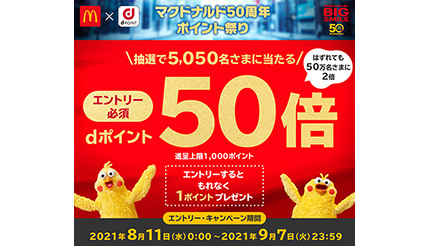 NTTドコモは日本マクドナルドと共同で、「マクドナルド」でdポイントカードを提示した上で、1回税込100円以上支払うと、抽選でdポイントを進呈する「マクドナルド50周年記念ポイント祭りキャンペーン」を実施している。キャンペーン期間は8月11日0時~9月7日23時59分。