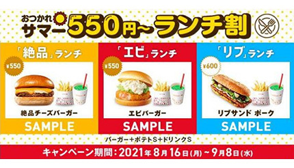 「おつかれサマー550円~ランチ割」では、対象クーポンをレジで提示すると、「絶品チーズバーガー」「エビバーガー」「リブサンド ポーク」の各単品に、「フレンチフライポテト S」と「ドリンク S」が付属するランチセット「『絶品』ランチ」「『エビ』ランチ」を550円で、「『リブ』ランチ」を600円で購入できる。