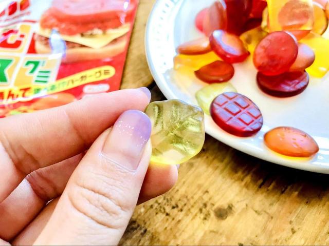 味は「パン部分=オレンジ」「トマト=ストロベリー」「チーズ=パイン」「パテ=コーラ」「レタス=マスカット」の5種類で、歯ごたえは硬め。