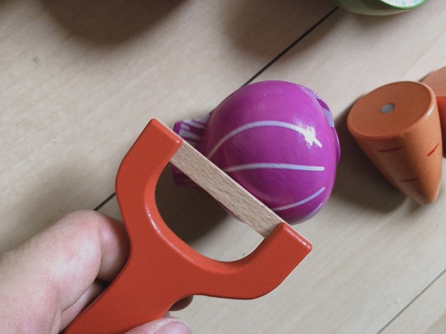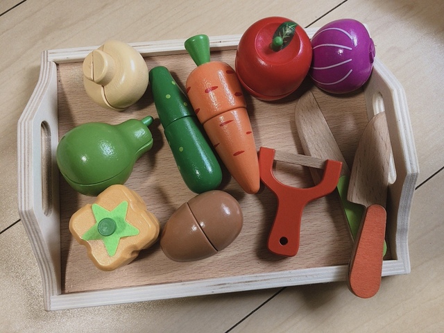 とてもかわいいおもちゃばかりなのですが、少し高級なので複数の食材がセットになったものは断念。その代わりに包丁とレンコンをひとつずつ購入しました。