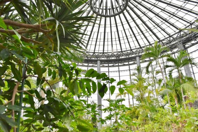 稲毛海浜公園の中に建てられた、花の美術館で、打ちっぱなしコンクリートの建物とガラス円柱ドームの大温室が目印。グランピングエリアからもドームが見えます。