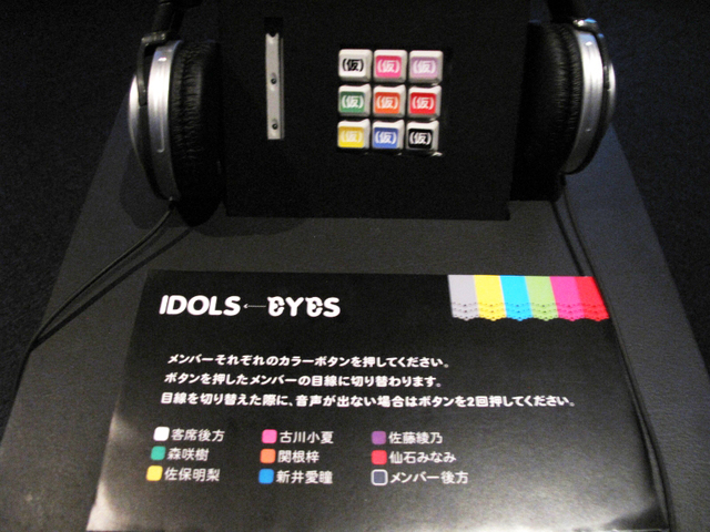 さて続いては、こちらも今回の目玉作品『IDOLS EYES』。アップアップガールズ(仮)のステージの模様を、メンバー目線で体感できるという作品です。画面の前にはスイッチャーが設置されていて、メンバー7人+客席後方+メンバー後方の9つの視点を切り替えることができます。