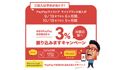 また、利用料の発生にともない、PayPayでは街の店舗を応援する企画として、「3%振り込みますキャンペーン」を実施する。同キャンペーンは9月19日もしくは10月19日までにPayPayマイストア ライトプラン加入すると、最大6カ月間(10月19日の場合は最大5カ月間)、決済額の3%を後日付与する。振込額上限は1法人または1個人あたり合計100万円としている。