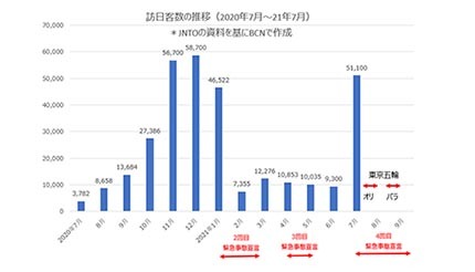 日本政府観光局(JNTO)は8月18日、7月の訪日外客数が5万1100人だったと発表した。東京五輪の開催で選手や大会関係者の入国などが増え、6月の9300人より5.5倍に増加した。