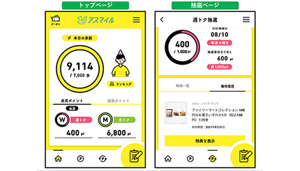 アスマイルをダウンロードすることで、ウォーキングや特定健診の受診、健康イベントへの参加など、健康に関する行動を行った結果にポイントが付与される。一定のポイントが貯まると、抽選に参加でき、電子マネー等の特典と交換できる仕組みとなっている。なお、専用スマホアプリを利用できない人は、専用の歩数計を購入することで参加できる。