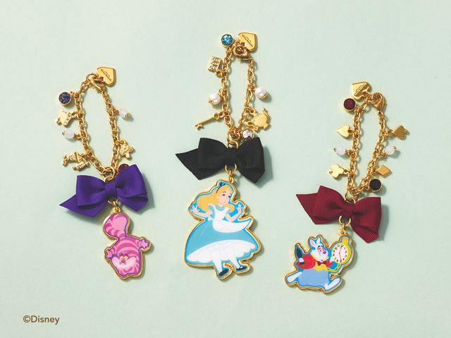 白うさぎが持っている懐中時計をイメージした立体的なバッグチャームや、アリス、白うさぎ、チェシャ猫をイメージしたリボンデザインのバッグチャームなど、全7種のチャームも登場。