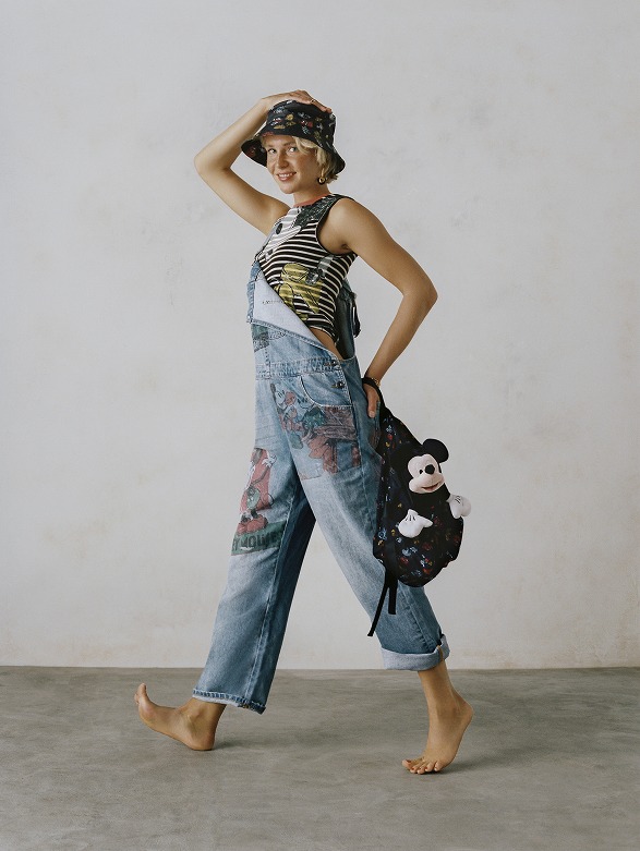 デニムサロペットには、ミッキーとミニーのイラストが大胆にデザインされていて、注目されること間違いなしのアイテムです。