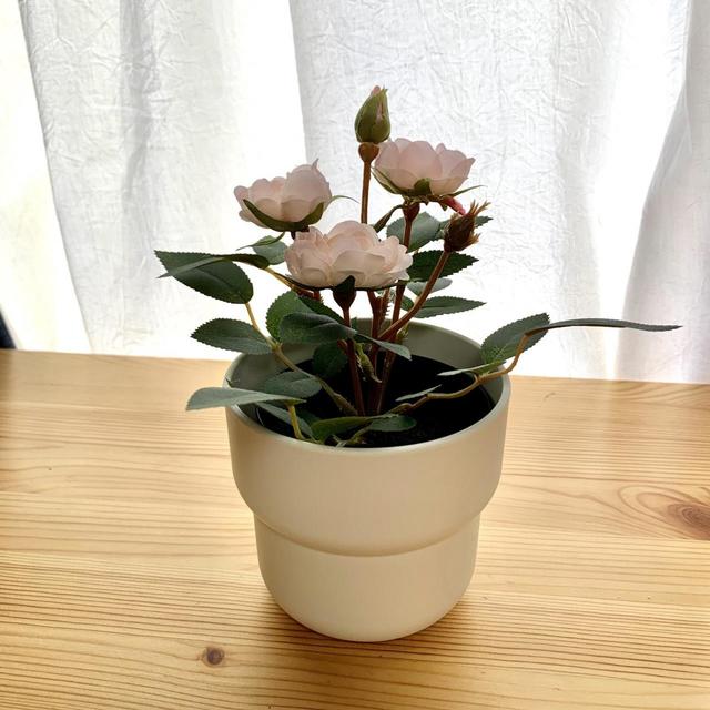 優しいピンクの花とホワイトの鉢で、ナチュラルな部屋・大人っぽい部屋でもアクセントになるフェイクグリーンです。