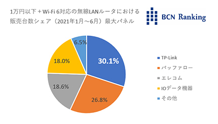 2021年上半期(1月~6月)における「1万円以内」かつ「Wi-Fi 6対応」の無線LANルータの販売台数シェアでTP-Linkが首位を獲得