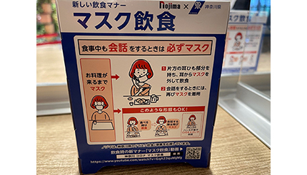 家電量販店のノジマは2021年4月28日、神奈川県に「マスク飲食推奨用鏡付きポップ」20万個を寄付した。ノジマは今年1月30日~2月28日に実施したチャリティーセールの売り上げの一部総額1億5000万円を1都8県に寄付すると発表し、7月5日の埼玉県で全ての寄付が完了。神奈川県はノジマの寄付の一部をもとにポップを制作、県内の飲食店に配布した。