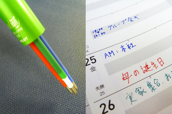 この『三色ボールペン情報活用術』を応用し、スケジュールを記入するときも、赤・青・緑で色分けします。色分けすることで段取り力が上がり、メリハリよく時間が使えるようになるのだそうです。
