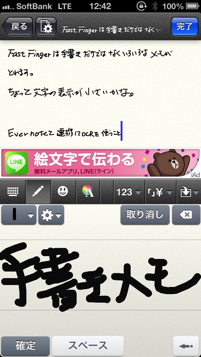 手書きメモの反応は普通レベル。入力エリアに文字を書いたら「確定」をタップ。すると画面上部に入力される。1画ずつの取り消しにも対応している。