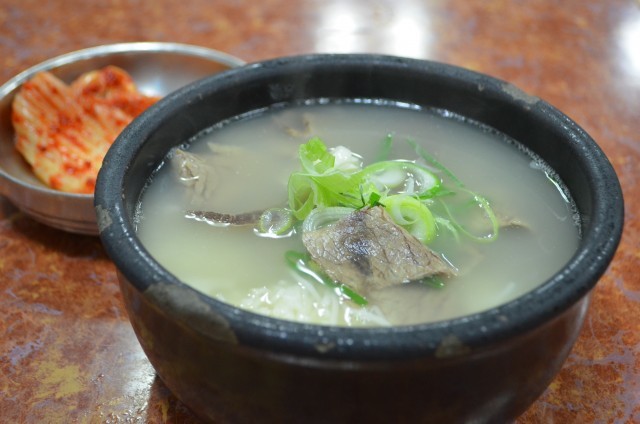 白濁したスープは、韓牛(ハヌ)の足の骨や各部位の肉を長時間煮込んだもの。スープの中には頭や膝、胸、舌などさまざまな部位の肉が隠れていて、さまざな食感と風味が楽しめる。