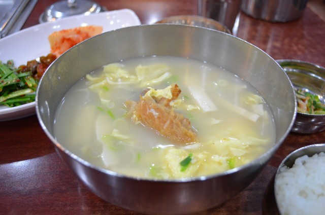 半日くらいタラを煮込んでつくるあっさり味のスープには、干しタラの切り身、ふわふわの玉子、豆腐、ネギが浮かんでいる。卓上のエビの塩辛を入れて塩加減を調節するとよい。