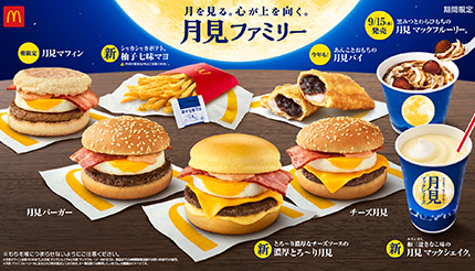日本マクドナルドは、秋の風物詩として好評の「月見バーガー」30周年を迎える今年9月8日から、新バーガー「濃厚とろ~り月見」含む全8商品を順次販売する。