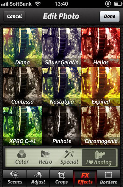 「camera+」は写真を撮って、そのまま編集・加工をすることができるアプリ。フィルター、カラーの種類が豊富なので、かなり楽しめます。