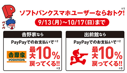 スマートフォン決済サービス「PayPay」は、「吉野家・出前館でPayPayでのお支払いでソフトバンクスマホユーザーなら10%戻ってくる!キャンペーン」を、9月13日~10月17日まで実施する。