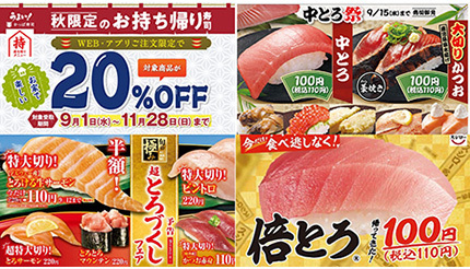 あきんどスシローは9月5日まで、人気の「倍とろ」を110円で復刻販売している。持ち帰り限定の「倍とろづくし6貫」は660円で、どちらも売り切れ次第、終了するとしている。また、同日まで「あふれんばかりの、日本のうまい!全国うまいもん市」も実施。ご当地ネタや新鮮ネタを期間限定で堪能することができる。