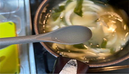 シリコン菜箸の上端部の味見ができるミニスプーンは、多すぎない量を取り出せる。そのため味見だけでなく、例えば小さじスプーンよりも少量の調味料を足したいときにも便利だ。ミニスプーンを使って味付けすれば、調理が手短に済ませられるし、無駄な洗い物も増えない。