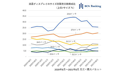 液晶ディスプレイの平均インチサイズは、8月現在で25.1。昨年8月比で0.43大きくなった。より快適な作業環境を求めて、やや大きなディスプレイを求める傾向は今後も継続するものとみられる。そうした中、大きさで選ぶなら、価格上昇率の小さい27インチモデルは、今が狙い目だ。(BCN・道越一郎)