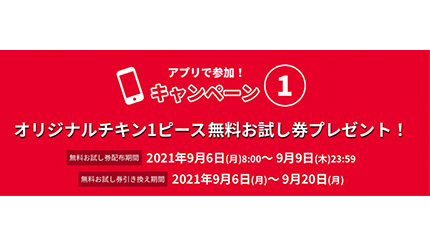 オリジナルチキン1ピース無料お試し券は「カーネルズデーキャンペーン2021」の一環。公式モバイルアプリをダウンロードしてキャンペーンバナーをタップするともれなく1枚プレゼントする。無料お試し券の引き換えは9月20日まで。