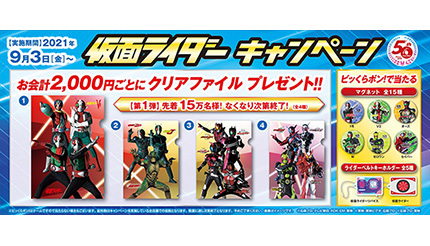 今回のコラボレーションは、昭和・平成・令和のライダーがくら寿司に大集合する企画。持ち帰りを含む2000円の会計ごとにくら寿司限定のオリジナルクリアファイルをプレゼントする。第1弾は9月3日から、第2弾は9月17日から、第3弾は10月1日からスタートする。全4種ずつ計12種類で、いずれも先着15万人限定としている。