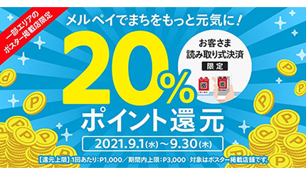 メルペイは9月1日から30日まで、一部エリアの対象店舗でメルペイのコード決済で支払うと、決済額の20%をポイント還元する「メルペイでまちをもっと元気に!」キャンペーンを実施している。ポイント還元上限は1回P1000・期間中合計P3000。