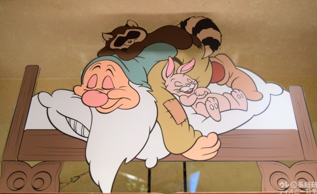 装飾も、棚にりんごの飾りが置かれていたり、床に七人の小人の足跡がついていたりと、『白雪姫』の世界観が表現されています。